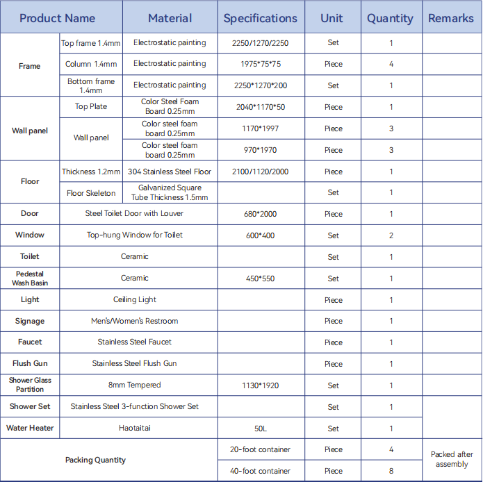 2. 20ft container for 9 units (one shower& one restroom). 40ft container for 18 units(one shower& one restroom) (All counts refer to packaged units ready for shipping)