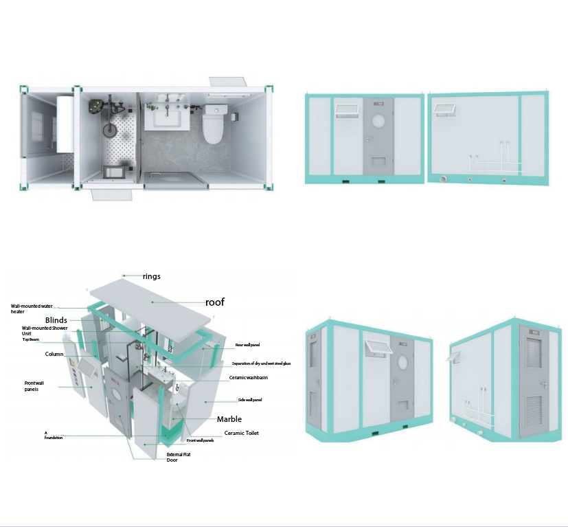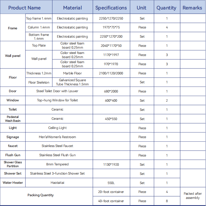 2. 20ft container for 9 units(one shower& one restroom). 40ft container for 18 units(one shower& one restroom) (All counts refer to packaged units ready for shipping)